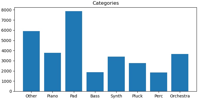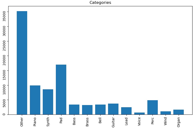 - Finally, the most interesting category might actually be “Other”, as it becomes a catch-all for anything not categorized by other means. The results of generating patches with this label are something of a cornucopia of surprising sounds, more often useful than not!