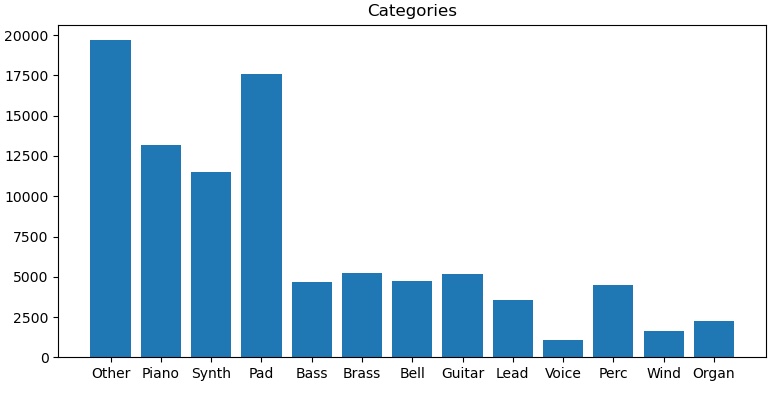 The problem will always be the sounds that have a combination of features. Is “BELL PNO” a bell sound, a piano, or both? I chose strict categorization for this experiment (making the example above a piano type patch), but a case could be made for allowing combinations (multi-hot encoding) and I might try that out in the future. As for the ZOOT sounds, I do a few manually now and then, but categorizing by ear is such a slow process that I keep them in a category named Other for now.