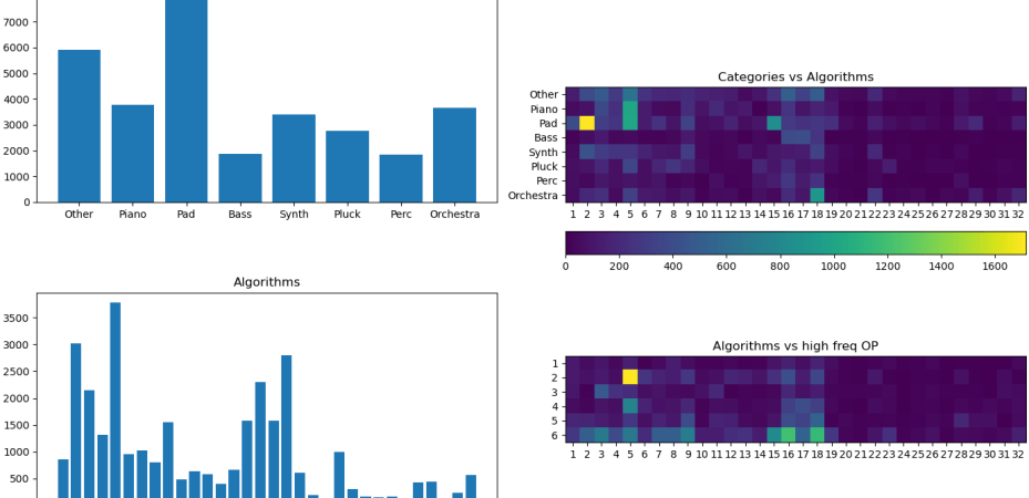 This map shows the number of patches of a particular category vs. algorithms used, and is very useful for understanding the distribution of sounds and algorithms.